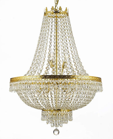 Set of 2 - French Empire Crystal Chandelier Lighting H50" X W24" Good for Foyer, Entryway, Family Room, Living Room and More! This beautiful Chandelier is trimmed with Empress Crystal(TM) 100% CRYSTAL CHANDELIER, this chandelier is characteristic of the grand chandeliers which decorated the finest Chateaux and Palaces across Europe and reflects a time of class and elegance which is sure to lend a special atmosphere in every home. This item comes with 18 inches of chain. SIZE: W24" H50", 15 LIGHTS Assembly Required